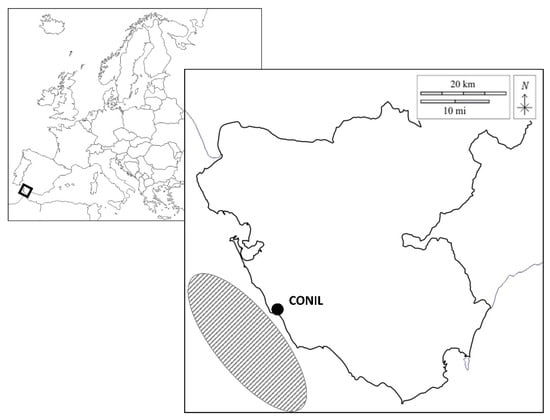 Map of Europe (top left) where the province of Cadiz (Spain) is marked with a black rectangle. Enlargement of the map of the Cadiz province (bottom right) highlighting the port of Conil with a dot. Artisanal fishing area of the Conil fleet (gray striped oval).