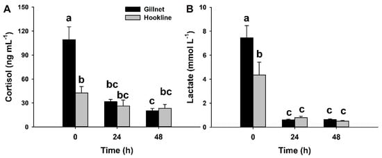 Serum cortisol (Figure 2A), as a primary stress response in teleosts [], displayed the highest concentrations immediately after capture (time 0 h), when fish captured by gillnet reached values of 109 ± 16 ng mL−1 and those captured by hookline of 43 ± 8 ng mL−1, showing significant differences between gears (p < 0.05). Cortisol reached asymptotic and lower levels at times 24 and 48 h, without statistical differences between groups (p > 0.05). Serum lactate, a paradigmatic secondary stress biomarker in fish [], is shown in Figure 2B. Serum lactate behaves similarly to cortisol, with higher levels at time 0 h in the gillnet group than in the hookline group, and without significant differences between groups at times 24 and 48 h.
