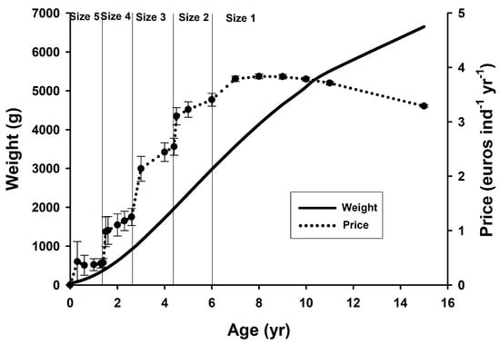 Growth of P. mediterraneus according to the published literature [,] (solid line), and selling prices per individual, i.e., the price that was obtained when it was sold divided by their age calculated through the von Bertalanffy equation (dotted line, mean ± SEM representing the differences between the years used for the calculation). Vertical lines represent the limits of the commercial sizes (1 to 5) in the fish market of Conil (south of Spain).