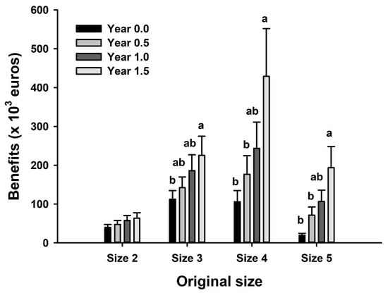 As a theoretical exercise, we calculated the possible economic benefits that would be achieved after capture–release–recapture. The considered survival rates for the rubberlip grunts captured by the artisanal fleet of Conil were 100% (according to the results from this study). The calculations are based on what would happen if caught individuals under 3 kg in weight were released (starting from the size they reach the maximum prices). The possible benefits calculated take the following into account: (i) the money obtained from the sale of individuals of each size in the year in which they were captured (original earnings); (ii) the sale price per kg in the year in which they would be recaptured (calculated profits); and (iii) the averaged prices of the entire historical series contemplated in this study. Thus, Figure 4 shows that the maximum economic benefit would occur if all size 4 and 5 individuals (<1 kg in weight) were released back into the ocean and recaptured for sale after 1 to 1.5 years (reaching 1–1.8 kg per fish). Adding the sales of these recaptured animals that would otherwise be sold as sizes 4 and 5 would give around 234 to 960% of benefits per year, which would result in an additional EUR 87–323 thousand per year. Moreover, those animals of size 3 that were around 1 kg of weight would increase 15% in body mass after 6 months in the wild, and this would then result in economic benefits of 26% in the market (around EUR 30,000 extra per year).