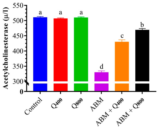 The AchE activity significantly decreased in the fish exposed to ABM (Figure 1). Meanwhile, this enzyme activity was significantly increased with increasing quercetin levels in the ABM-exposed group. However, quercetin did not affect the AchE in normal groups.