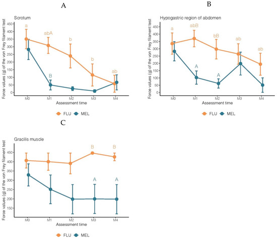 Mean force values (g) ± standard deviation of the von Frey filament test obtained in goat kids subjected to a surgical castration procedure under anesthesia and receiving analgesic protocols with meloxicam (MEL: 0.5 mg/kg−1 IM) or flunixin meglumine (FLU: 1.1 mg/kg−1 IM). Assessments were performed just before castration (M0), just after castration (M1), 1, 2, or 3 days after castration (M2, M3, and M4, respectively), in three body regions: (A) scrotum (average of four points), (B) hypogastric region of the abdomen, and (C) gracilis muscle. Notes: Lowercase letters indicate significant differences over time (M0 vs. M1 vs. M2 vs. M3 vs. M4) within the same treatment group (FLU and MEL) and each body region (A: Scrotum, B: Hypogastric region of abdomen, and C: Gracilis muscle). Capital letters represent significant differences between treatments (MEL vs. FLU) within each body region.