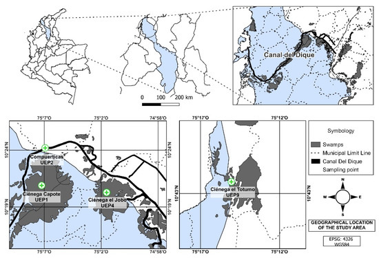 The study was carried out in the Bolivar Department, specifically at “Canal del Dique” and “Canal Norte”, including the municipalities of Arjona, Arroyohondo, Calamar, Mahates, San Cristóbal, Santa Catalina, San Estanislao de Kostka, Soplaviento and Villanueva. We established four sampling points (SP), one in Canal Norte (SP9) and three (SP1, SP2 and SP4 in the sub-region of the Canal del Dique (Figure 1); the latter area is a flood plain formed by a complex of wetlands composed of marsh that slow the flow of the trough, which has a length of 113 km from the town of Calamar to its mouth in the Cartagena bay [40,41].