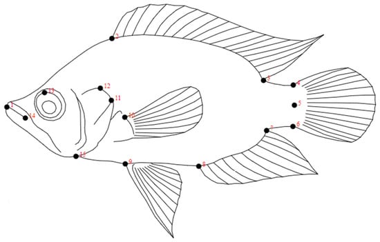 Images were obtained by fixing individuals on white Styrofoam with pins in the anterior–posterior position with the fins extended; a ruler was included in the photos to establish the scale. Photographs were taken with a high-resolution FUJIFILM X-T2 24-megapíxel camera; TPS programs was used to transform the photos to TIF format [46]. Fifteen landmarks were digitized using Hernandez et al. [39]’s landmark map for Caquetaia kraussii; they are illustrated in Figure 2. The landmarks were digitalized and transformed to two-dimensional coordinates using the software tpsDig2 [47].
