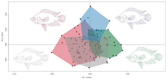 - Hernandez, J.; Villalobos-Leiva, A.; Bermúdez, A.; Ahumada-Cabarcas, D.; Suazo, M.J.; Benítez, H.A. An Overview of Interlocation Sexual Shape Dimorphism in Caquetaia kraussi (Perciformes: Cichlidae) A Geometric Morphometric Approach. Fishes 2022, 7, 146. [Google Scholar] [CrossRef]