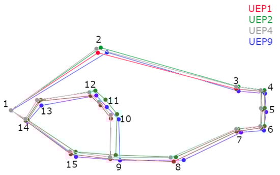 Graphic representation of variation in the mean shape of C. kraussii of the populations and their reference points. Red: UEP1; green: UEP2; grey: UEP4; blue: UEP9.