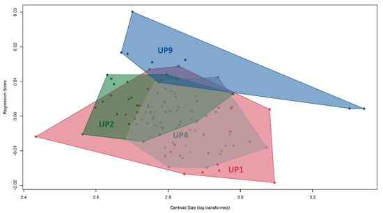 The multivariate regression of size on shape (Figure 5) showed that the allometric effect was only 2.73%; individuals of UEP2 were smaller than the other localities and UEP1 and UEP4 were the largest; those of UEP9 were intermediate in size.