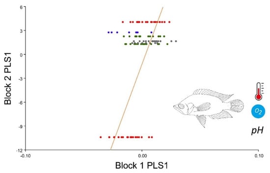 The PLS analysis indicated that about 90% of the variation in body shape explained by PC1 was not due to the environmental variables measured. This agrees with the results of Hernández et al., 2022, which show marked sexual dimorphism, suggesting that the body shape of males of C. kraussii is more conserved, submitted mostly to sexual selection pressures, while the body shape of females appears to be affected by environmental pressures, from which it may be inferred that most body shape variation is subject to sexual selection [39]. By contrast, PC2 and PC3, which together explained about 10% of the body shape variation, are mostly (≈90%) determined by the dissolved oxygen and the T°-pH combination, respectively. This agrees with several studies that explain how these environmental parameters may influence phenotypic variation in fish [60,61,62]. If dissolved oxygen is a proxy for water movement, we may infer that the shape of individuals of C. kraussii in different localities responds to environmental pressures produced by the force and intensity of the current, with a significant difference between fish from marsh areas and lotic environments [63]. This may be observed especially in the similarity of shapes of the individuals of UEP2 and UEP9, since they occur in watersheds separated by about 40Km, which is a strong barrier to the exchange of genes between them, supporting the hypothesis that the body shape of the individuals responds to the environmental pressures of the habitats where they live.