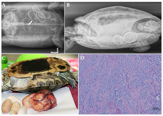 Chronic egg binding associated with a scirrhous ovarian carcinoma in a red-bellied slider (Trachemys cripta elegans). (A) Dorsoventral radiographic projection: 5 eggs located at the right side of the caudal coelomic cavity. An irregular shape is noted in 3 eggs and all eggs show abnormally thickened shells with a lamellar appearance in the most cranial egg. One egg has an unusual small size and is fused with one of the other eggs (arrow). (B) Generalized soft tissue opacity of the coelomic cavity with obvious compression of the lung field on the left laterolateral projection. (C) Postoperative view after removal of the ovarian neoplasia and retained eggs. (D) Histological section of a scirrhous ovarian carcinoma (Hematoxylin and eosin stain) composed of a cell-rich tissue that is growing infiltrative in dense collagen stroma. Neoplastic cells are organized in islets to multi-layered tubules.