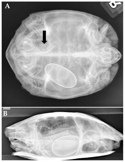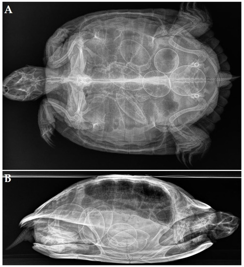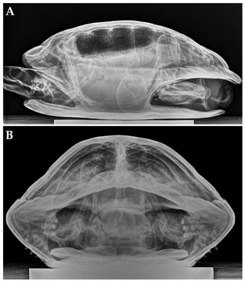 A 19-year-old female yellow-bellied slider (Trachemys scripta scripta) was presented because of anorexia and having displayed overactive behavior for two weeks. During the past 10 years, the turtle had produced two clutches of eggs per year with, on average, 8 eggs per clutch. During the past 5 years, recurrent episodes of dystocia were resolved following the administration of oxytocin by a local vet. Two days before initial presentation, the turtle had received 3 administrations of oxytocin (IM, Oxytocine Kela 10 IU/mL, Kela Veterinaria NV, Antwerpen, Belgium) at 15 IU/kg without effect. An ultrasound revealed the presence of at least 2 oval-shaped eggs, and a radiographic examination (Figure 2A,B) confirmed the presence of 4 eggs with a well-mineralized but thin shell. Three eggs had an abnormal shape, and one egg showed an abnormally small size. The most caudal, large egg showed a vertical position and was located cranial to the pelvis inlet.
