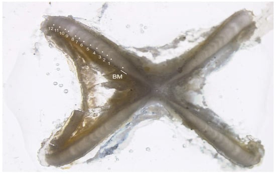 Vertebral cross-sections were examined under a Leica S8 APO™ (Singapore) microscope using LAS software (Version 4.8.0, Leica Microsystems Limited, Heerbrugg, Switzerland). One growth band was defined as an opaque and translucent band pair that traversed the intermedialia and clearly extended into the corpus calcareum (Figure 2) [,,].
