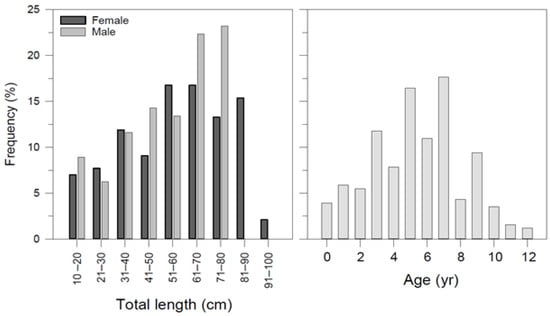 A total of 255 long-nosed skates ranging from 12.2 to 93.5 cm in total length and 8.34–3828 g in weight were collected as bycatch or discard species from a commercial fishing vessel between May 2015 and June 2016 (Table 1). The sex ratio (M/F) was determined as 1:1.27. The ratio of females to males was not statistically different from the expected 1:1 ratio between sexes (p > 0.05). The size frequency based on total length and age group is presented in Figure 3.