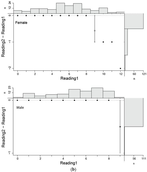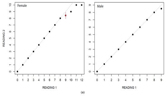 In this study, estimated ages ranged from 0 to 12 for females and from 0 to 9 for males. Age estimation for males and females by two independent readers did not show a considerable variation (Figure 4a,b). The highest PA with lowest IAPE and CV were found for males than female (Table 2).