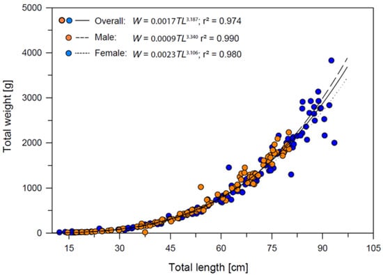 The total length–weight relationship parameters of long-nosed skate were estimated according to the equation given below []: