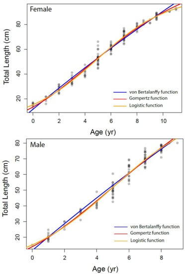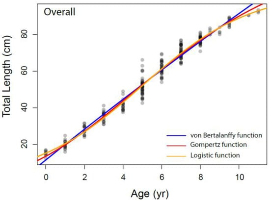 The growth parameters were estimated for overall and each sex separately from the VBGM, the Robertson (logistic) and Gompertz growth model using nonlinear regression analysis, as presented in Table 3 and Figure 6. The relationship between total length and age was adequately described by the Robertson (logistic) growth model followed by the Gompertz growth model. The von Bertalanffy model performed relatively weakly compared to other growth models based on AIC values.