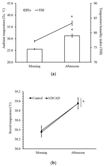 The ambient conditions during the treatment period were similar to the pretreatment period; the Ta, RH, and THI from the morning and afternoon were 25.56 ± 0.18 °C, 91.64 ± 0.48%, and 77.13 ± 0.31 and 31.25 ± 0.73 °C, 69.88 ± 2.22%, and 83.26 ± 0.76, respectively (Figure 1a). l-DCAD had no effect on DMI, WI, or UV during the treatment period. The values of total daily DMI, WI, and UV from the control group were 1.34 ± 0.12 kg/day, 4.68 ± 0.50 L/day, and 1.00 ± 0.16 L/day, respectively. The values of these parameters from the l-DCAD group were 1.49 ± 0.11 kg/day, 6.96 ± 1.00 L/day, and 2.27 ± 0.68 L/day, respectively. Although there was no significant total daily WI or UV, an analysis of daytime and nighttime WI and UV that was conducted separately revealed that daytime WI in the control group (4.25 ± 0.45 L) was significantly lower (p < 0.05) than that in the l-DCAD group (6.50 ± 0.86 L) and nighttime UV in the control group (0.54 ± 0.10 L) was significantly lower (p < 0.05) than that in the l-DCAD group (1.36 ± 0.33 L). There was a prominent effect of HTa without the effect of l-DCAD on the behavioral and physiological responses, including Tr and RR (Figure 1b–c).