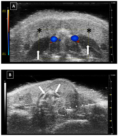 For intrathyroidal injections, a ventral approach is required, positioning the mouse in ventral recumbence and removing the hair of the neck and cranial part of the thorax. The front limbs are fixed with tape in a caudal position, close to the ribs. Intubation of the animal is not required and anesthesia can be supported with a facial mask. After the application of ultrasonographic gel, the scan starts locating the trachea in transversal view at the hyoid bone level. It is recognized due to the acoustic shadow produced by the intratracheal air. Moving the probe caudal, the salivary glands will appear as two superficial, bilateral, hypoechoic, and big structures. At this level, we will need to slightly increase the pressure of the probe against the neck for improving the visualization of deeper structures. Going caudal, a muscular band will appear in the middle line, ventral to the trachea, followed by two bilateral structures, the sternohyoideus and sternothyroideus muscles. The carotid arteries and jugular veins will be visible at this point. The first ones are smaller but have a pulse. We can check the blood flow direction using the Color Doppler mode of the ultrasound system. In a standardized position of the probe (left side of the probe placed over the right side of the animal), the arterial flow should be colored in red and the jugular veins should appear in blue (