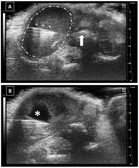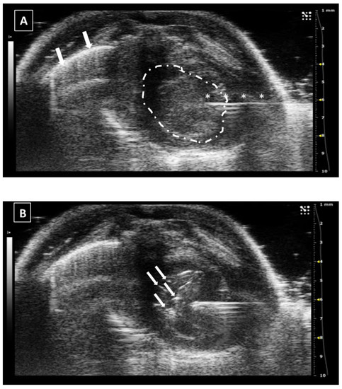 In this review, we will focus on the use of ultrasonography for interventionism and its potential to reduce the manipulation of animals and improve their welfare. Almost all these procedures are carried out using the B mode (brightness mode, the most typical ultrasound mode), and at some points, the Doppler mode will be useful for distinguishing the regional vascularization in order to avoid accidental punctures of the vessels. The other ultrasonography modes are, in theory, not necessary during the interventionism. The effect of ultrasound-guided surgery on the welfare of the animals could be evaluated by looking at the manipulation required for developing the same cancer model with or without this technology. We can use a pancreatic cancer model as an example. Without using an ultrasound device, we would need to anesthetize the animal, remove the air from the left lateral abdomen, and disinfect the surgical area. This procedure will be the same for the guided injection. But then, without the ultrasound, we would need to make an incision in the skin, followed by the abdominal wall. We would manually move the bowels for reaching the spleen. Later, we would expose this organ followed by the pancreatic tissue. Then, out of the body, we will inject the cells into the tissue and would put the pancreas and spleen back into the abdomen. We would close the abdominal wall and skin with surgical sutures. The whole procedure could take, for an experienced surgeon, at least 5 to 10 min and we would need to use supportive analgesia at least for the following three days. Using ultrasound guidance, after disinfecting the skin, we will scan the abdomen, find the pancreatic area, introduce transabdominally the needle into the pancreas, inject the cells, and remove the needle. Analgesia will be required for 2 days. The time for doing the injection would be 1–2 min for an experienced user. In our opinion, it is clear the effect of this technique on the welfare of the animals and projects.