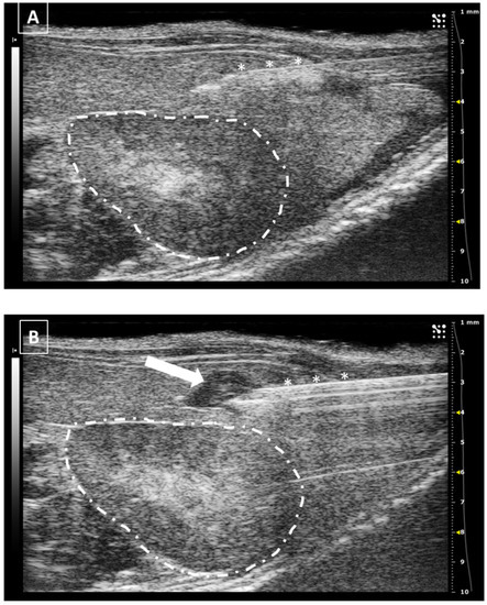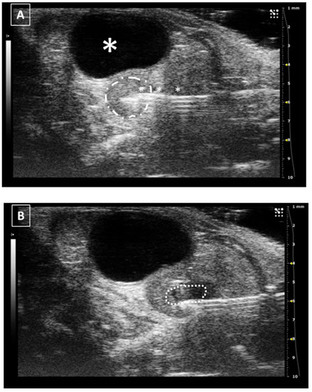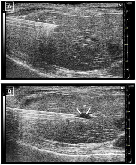 Once the testicle is fixed into the scrotum, the lateral approach is the best for the injection. Placing the scanning probe in a ventral position over the scrotum, the structure can be defined echographically as hyperechoic, homogenous and circular in shape. The lateral approach is the best for injecting into the testicles, placing the probe in the middle line of the body over the scrotum. For reducing the potential movement of the organ, we can use forceps for fixing the skin while piercing with the needle. Introducing the needle in the testicular stroma is easy due to its softness and it can be seen as a hyperechoic line with several comet tails artifacts in a hyperechoic background. The injected fluid will arise as an anechoic accumulation in the testicular stroma. After the injection, we should keep the needle in place for some seconds before removing it. An example of a testicular injection is represented in