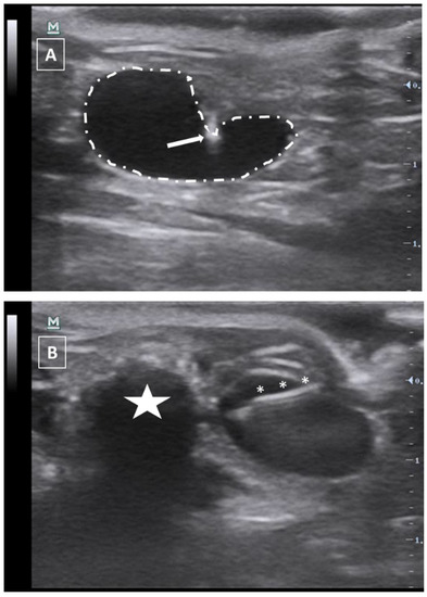 26]. The neck is anatomically related to the urinary bladder and the rectum, while the horns run from their division in the cranial aspect of the neck until they reach the ovaries, caudal and lateral to the kidneys. Recognizing the uterine horns can be challenging for non-experienced users, especially in non-gravid animals when the image can be mixed up with the bowels. During the pregnancy, the uterine horns increase exponentially their size to host the developing fetus and they are easily recognized.