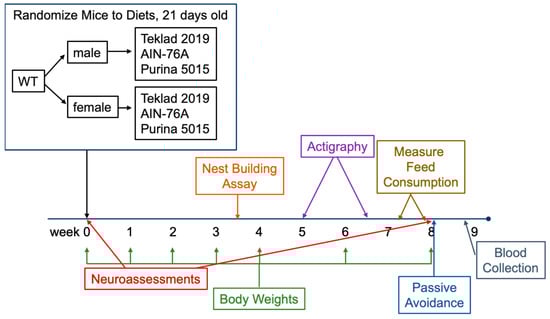 Study Design: Mice were received from Jackson Laboratories, weighed, and tested in a neuroassessment battery at postnatal day 21. Females (n = 8 each) and males (n = 7 each) were randomized to three test diets (Purina 5015, Teklad 2019 and AIN-76A). The number of mice tested was based on prior behavioral experiments. Mice were weighed weekly for four weeks and then biweekly, and tested in nest building, actigraphy, and passive avoidance assays (Figure 1, study design).