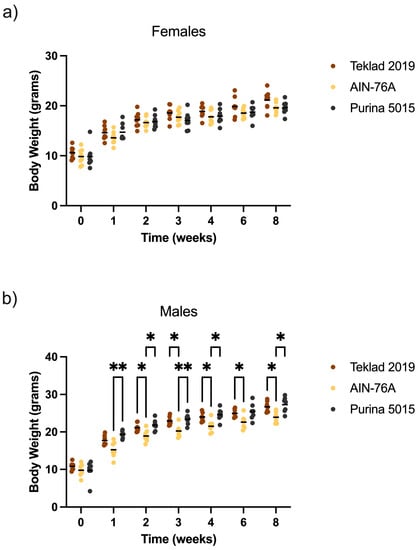 There is a controversy regarding the relative importance of protein quantity versus protein type on metabolic outcomes. Varied protein levels in rodent diets affect metabolic and molecular phenotypes in sex and genotype-specific manners in adult mice. Specifically, commencing a low protein diet (7% calories from whey protein) at 10 weeks of age in C57BL/6J male mice results in significantly reduced body weight by 7 weeks post-treatment compared to moderate (14%) and high (21%) isocaloric protein diets []. Protein source determines the potential of high protein diets to attenuate the development of obesity in C57BL/6J mice with casein as the most efficient in preventing weight gain and accumulation of adipose mass []. In our study, the calories provided by protein were similar at 18% for the Purina 5015, 23% for the Teklad 2019 and 19% for the AIN-76A, but body weight in males was selectively decreased in response to the casein-based AIN-76A. Others show a trend (p = 0.06) for increased weight gain in adult C57BL/6J male mice maintained for 3 weeks on casein-based purified ingredient diet compared to an isocaloric purified ingredient diet with wheat gluten, corn gluten and soy protein isolate as the protein sources (3.7 kcal/g energy value with 20% calories from protein) []. The trend for increased weight gain is lost at 8 weeks treatment. Major differences between that study and ours are: (1) we compared commonly used vivarium chows with a purified ingredient diet, and they compared two specialty-formulated isocaloric purified ingredient diets; (2) the Purina 5015 and Teklad 2019 chows contain soybean oil, AIN-76A contains corn oil, and the isocaloric purified ingredient diets contained corn and olive oils; and (3) we commenced treatment at 3 weeks of age versus their 9 weeks of age. Thus, it appears that both protein type as well as quantity affect weight gain in mice as an effect of sex and age with possible interactions with other ingredients such as fats. For example, high casein intake can accentuate, and high whey intake reduce (30% protein), the negative metabolic effects of a high fat diet [].
