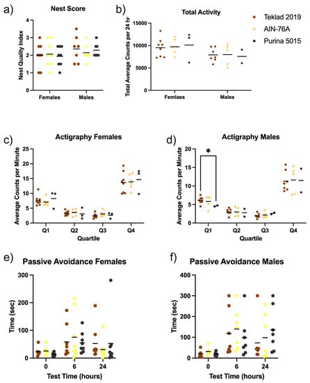 Mouse behavior as an effect of diet. Male and female C57BL/6J mice were tested in a behavioral battery including nest building, actigraphy and passive avoidance in response to diet (Teklad 2019, AIN-76A or Purina 5015). Statistics were determined by 2-way ANOVA and Tukey’s multiple comparison tests denoted by p < 0.05 (*). (a) nest score was plotted versus diet and sex. ANOVA results: interaction F(2, 39) = 0.2389, p = 0.79; sex F(1, 39) = 1.987, p = 0.17; and diet F(2, 39) = 0.066, p = 0.94. (b) total average activity counts per 24 h period plotted versus diet and sex. ANOVA results: interaction F(2, 25) = 0.089, p = 0.92; sex F(1, 25) = 5.436, p = 0.0281; and diet F(2, 25) = 0.017, p = 0.98. (c) average actigraphy counts per minute for female mice were binned into 6 h quartiles and plotted versus diet. ANOVA results: time × diet F(6, 42) = 0.4142, p = 0.87; time F(1.451, 20.31) = 177.6, p < 0.0001; diet F(2, 14) = 0.07965, p = 0.9239; and subject F(14, 42) = 4.362, p = 0.0001. (d) average actigraphy counts per minute for male mice were binned into 6 h quartiles and plotted versus diet. ANOVA results: time x diet F(6, 33) = 0.3313, p = 0.92; time F(1.270, 13.97) = 89.13, p < 0.0001; diet F(2, 11) = 0.03130, p = 0.9693; and subject F(11, 33) = 3.551, p = 0.0023. (e) passive avoidance times to enter the dark chamber for female mice were plotted versus diet. ANOVA results: time x diet F(4, 42) = 0.5027, p = 0.74; time F(1.707, 35.85) = 4.537, p = 0.0221; diet F(2, 21) = 0.02663, p = 0.97; and subject F(21, 42) = 1.619, p = 0.0909. (f) passive avoidance times to enter the dark chamber for male mice were plotted versus diet. ANOVA results: time x diet F(4, 36) = 0.8736, p = 0.49; time F(1.886, 33.94) = 11.31, p = 0.0002; diet F(2, 18) = 0.1725, p = 0.84; and subject F(18, 36) = 2.513, p = 0.0091.