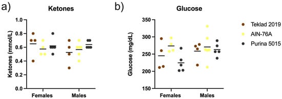 Plasma biochemistry as an effect of diet. Blood was collected from male and female C57BL/6J mice at euthanization and quantitated for plasma ketone and glucose levels as an effect of diet (Teklad 2019, AIN-76A or Purina 5015). Statistics were determined by 2-way ANOVA and Tukey’s multiple comparison tests with no significant differences. (a) ketones (n = 4–5 females and n = 4–6 males per diet); ANOVA results: interaction F(2, 22) = 0.8778, p = 0.43; sex F(1, 22) = 0.6742, p = 0.4204; and diet F(2, 22) = 0.6284, p = 0.54. (b) glucose (n = 4–5 females and n = 4–6 males per diet); ANOVA results: interaction F(2, 22) = 1.142, p = 0.34; sex F(1, 22) = 1.963, p = 0.18; and diet F(2, 22) = 2.251, p = 0.13.