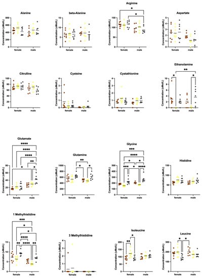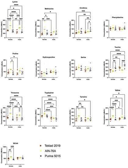 Blood plasma amino acid levels as an effect of diet. Blood was collected from male and female C57BL/6J mice at euthanization and quantitated for plasma amino acids by ion-exchange chromatography as an effect of diet (Teklad 2019, AIN-76A or Purina 5015). Statistics were determined by 2-way ANOVA and Tukey’s multiple comparison tests (see Table S1) denoted by p < 0.05 (*), p < 0.01 (**), p < 0.001 (***) and p < 0.0001 (****). See Figure 7 for remaining data.