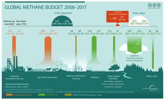 Methane flows on a global level per year for the period between 2008 and 2017. Numbers for sources and sinks are in Tg CH4 yr−1). Agriculture and waste are the largest anthropogenic sources with 191–240 Tg of CH4 per year. Reproduced with permission from Saunois et al. [3].