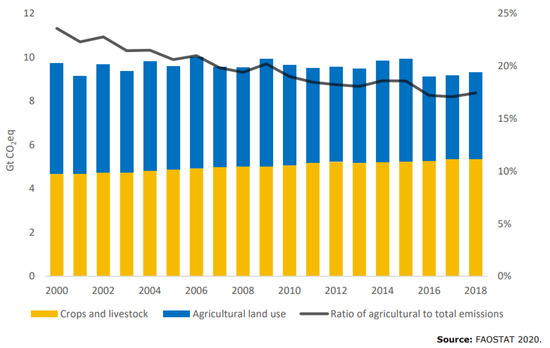 Yearly CO2e emissions from crops and livestock (yellow) and agricultural land use (blue) and share of the sector in global GHG emissions (black). Reproduced with permission from FAO [6].