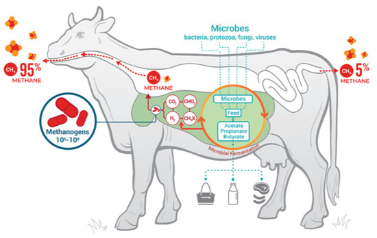 Grazing animals such as sheep, cattle and goats worldwide emit a huge amount of polluting gases, of which methane is first and foremost. An amount of approximately 86 million metric tons (Tg) of methane is produced by domesticated ruminants per year [1,2]. Saunois et al. [3] estimated total emissions of 111 (106–116) Tg CH4 yr−1 for enteric fermentation and manure management, about one-third of total global anthropogenic emissions (for the period 2008–2017).