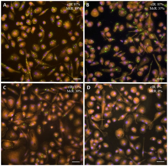 Immunofluorescence of OvMØs at different rates of infection with Toxoplasma gondii tachyzoites: (A) high rate (Type III isolate); (B) medium rate (PRU II-C group); (C) low rate (PRU II-A group); (D) uninfected OvMØs. Toxoplasma gondii tachyzoites (green—Alexa Fluor 488), cytoplasm (orange—TRITC), and nuclei (blue—DAPI) are shown. cIR: cell infection rate; McR: multi-infected cells. Scale bars = 50 μm.