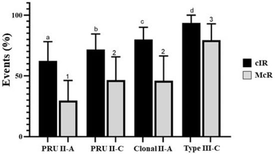Concerning the McR results, the groups could be sorted from higher to lower in a similar order to that of the cIR: type III-C isolate (79.34 ± 13.50), PRU II-C group (46.59 ± 19.07), clonal II-A isolate (45.96 ± 20.44), and PRU II-A group (29.62 ± 16.63) (Figure 2). When comparing the data between groups, there were statistically significant differences in all cases except between the PRU II-C group and the clonal II-A isolate (Figure 2).