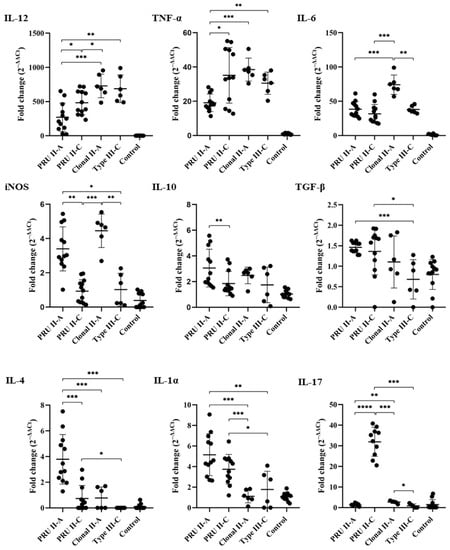 The IL-1α expression in the OvMØs showed a similar pattern to that of the Th2 cytokines; macrophages infected with the PRU II-A and PRU II-C groups were the only ones that showed an increase in transcription (5.15-fold and 3.74-fold, respectively) with regard to the clonal II-A and type III-C isolates (p < 0.001) (Figure 3). Similarly, when analyzing the transcription of IL-17, only the PRU II-C group (TgShSp11 and TgShSp16 isolates) showed a significant increase in transcription (31.96-fold, p < 0.05) when compared with the remaining groups (Figure 3 and Figure S2). Regarding iNOS expression, the higher fold-change values were observed in the PRU II-A group (3.41-fold) and the clonal II-A isolate (4.48-fold), whereas the expression of the remaining groups was similar to that of the uninfected control (p < 0.05) (Figure 3).