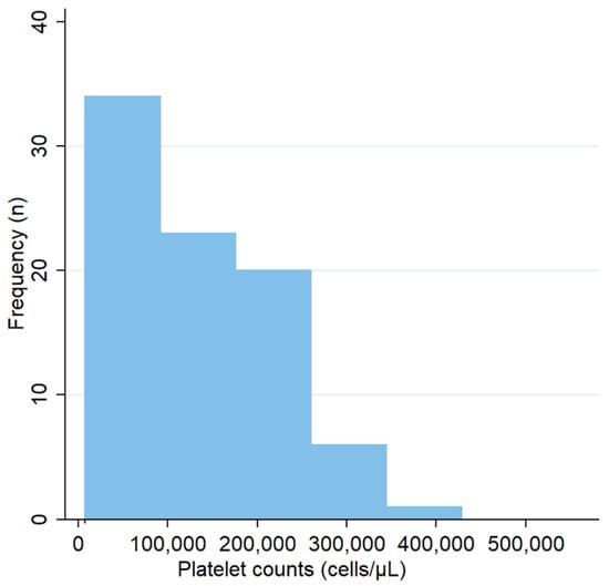 The median platelet in the whole group of dogs was 143,000 cells/μL (IQR 62,750–214,250), being significantly lower in the infected dogs (126,000 cells/μL, IQR 55,000–191,000) (Figure 1) versus non-infected (221,000 cells/μL, IQR 180,000–303,500) (p = 0.003) (Table 1). Thrombocytopenia was higher among infected dogs (75%) versus non-infected (40%) (p = 0.006) (14% of the infected dogs had severe thrombocytopenia, while 7% of the not-infected dogs). At the same time, the proportion of infected dogs was significantly higher among those with lower levels of platelets (p < 0.05), especially below 200,000 cells/μL (Figure 2).