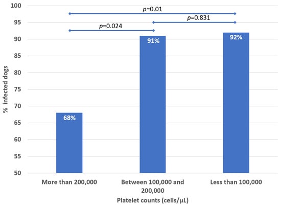 Proportion of infected dogs according to the categories of platelet counts (p-values comparing the categories were included, p < 0.05, considered significant differences in the proportion of infected dogs by categories of platelet counts).
