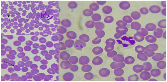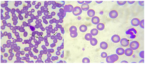 Blood smear from a dog suspected Babesia infection, average size red blood cells with intraerythrocytic ring forms, Wright–Giemsa staining (1000×). Arrows indicate the suggestive forms.