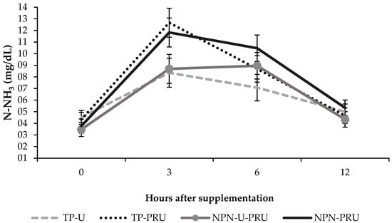 For TP-U, TP-PRU and NPN-PRU supplements, the highest concentrations were recorded 3 h after supplementation, with 8.36, 12.67, and 11.83 mg/dL respectively, while NPN-U-PRU showed higher concentrations of NH3 6 h after supplementation (8.96 mg/dL).