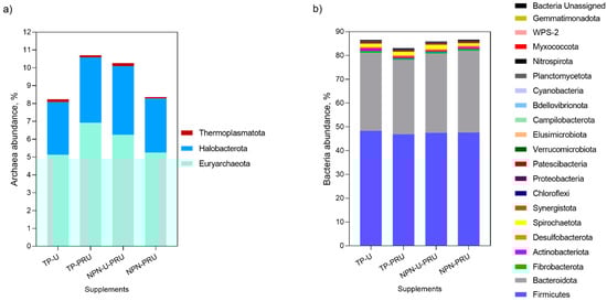 A total of 27 phyla (Figure 2), 234 families and 488 genera were identified. Nitrospirota and Gemmatimonadota phyla were detected just in the rumen of steers supplemented with TP-PRU. Both Actinobacteriota and WPS-2 phyla had higher ruminal abundance in steers supplemented with soybean meal containing more supplements than those supplemented with non-protein nitrogen sources (Figure 2b). Thermoplasmatota archaea phylum abundance also tends to increase in soybean meal containing supplements treatments (Figure 2a, p = 0.08). Proteobacteria, Myxococcota, and Thermoplasmatota phyla were detected in higher abundance in the rumen of NPN-U-PRU steers than in NPN-PRU. The Spirochaetota phylum levels tends to be higher in the rumen of animals supplemented with NPN-U-PRU than those supplemented with NPN-PRU (p = 0.09). Steers supplemented with TP-U tended to have higher ruminal abundance of Elusimicrobiota (p = 0.09) and lower abundance of Myxococcota (p = 0.06) than steers supplemented with TP-PRU.
