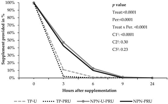The disappearance rate of the supplement in the trough was monitored in experiment 2, halfway through each experimental period, every 3, 6, 9, and 24 h after being offered, to evaluate the consumption behavior of the animals in relation to the treatments.