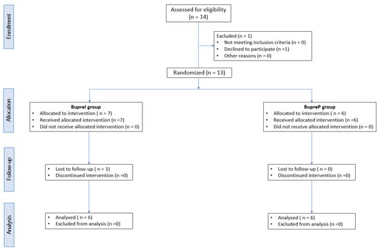 A total of 14 dogs were assessed for eligibility. Of these, two dogs were excluded (n. 1 = the owners refused to participate; n. 1 = request for rescue analgesia during surgery). The remaining 12 dogs were successfully included. The manuscript conformed to the Consolidated Standards of Reporting Trials (CONSORT) Statement 2010 for reporting randomized clinical trials [23] (Figure 2). There were no significant differences between the groups in age (BupreP = 10 ± 0.8; BupreI = 10.75 ± 2.6 years), weight (BupreP = 13.16 ± 9.4; BupreI = 11.95 ± 9.7 kg), the duration of the surgery (BupreP = 85.5 ± 27.2; BupreI = 74.7 ± 3.2 min), and the duration of anesthesia (BupreP = 106.5 ± 29.3; BupreI = 105.7 ± 8.5 min). Instead, the SS showed significant differences between two groups in the study (BupreP = 1 (1–2); BupreI = 10 (7–11)) (Table 2). In BupreP, the mean of the total dose of buprenorphine administered was 5.39 ± 0.25 μg/kg/h.