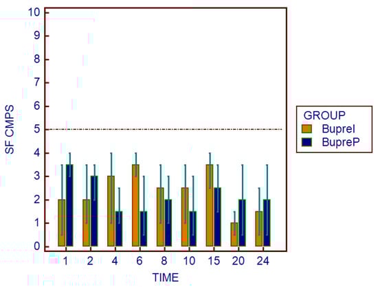 Graphical representation of the SF-CMPS scores in the two study groups at different times (1, 2, 4, 6, 8, 10, 15, 20, and 24 h after the extubation). The dotted line indicates the maximum score level above which dogs required supplemental analgesia.