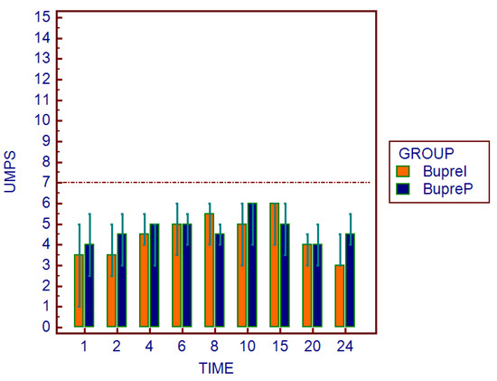 Graphical representation of the UMPS scores in the two study groups at different times (1, 2, 4, 6, 8, 10, 15, 20, and 24 h after the extubation). The dotted line indicates the maximum score level above which dogs required supplemental analgesia.