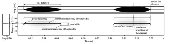 When the echolocation calls were analyzed, the background noise was erased in Avisoft software. To quantify the sex characteristics of the echolocation calls, the call duration (s) of the harmonics at the energy maximum was measured using the automatic parameter measurements tool in Avisoft with full visual control of the spectrogram, as well as four spectrum-based parameters (kHz): the peak frequency, minimum frequency of bandwidth, maximum frequency of bandwidth, and bandwidth, for which the measurement threshold was 10 dB. For these four spectrum-based parameters, three locations (i.e., the center, end, and maximum amplitude of the element) were measured (Figure 3) [39,40,41]. Thus, a total of 13 acoustic variables were extracted: the call duration, peak frequency (end), minimum frequency of bandwidth (end), maximum frequency of bandwidth (end), bandwidth (end), peak frequency (center), minimum frequency of bandwidth (center), maximum frequency of bandwidth (center), bandwidth (center), peak frequency (maximum), maximum frequency of bandwidth (maximum), minimum frequency of bandwidth (maximum), and bandwidth (maximum). For the analysis of the individual characteristics of the echolocation calls, the playback files of 10 experimental individuals were selected from the recorded playback files, containing 16 high signal-to-noise ratio pulses each (10 individuals, 160 pulses in total). The above 13 acoustic parameters were measured and analyzed to determine the individual characteristics of their acoustic parameters.
