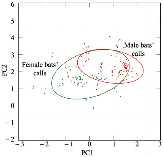 The distribution of the echolocation calls of the different sexes in the two-dimensional space of the first and second principal components is shown in Figure 5. The two types were separated axially along the two principal components, but there were still some overlapping parts. A multivariable analysis of variance (MANOVA) of 160 pulses from two playback files for sex recognition revealed that there were significant differences in the acoustic parameters of the female and male echolocation calls (MANOVA: Wilk’s lambda = 0.248, df = 13, 146, p < 0.0001). Among them, the differences in the call duration, peak frequency (end), minimum frequency of bandwidth (end), maximum frequency of bandwidth (end), peak frequency (center), minimum frequency of bandwidth (center), maximum frequency of bandwidth (center), bandwidth (center), peak frequency (maximum), minimum frequency of bandwidth (maximum), and maximum frequency of bandwidth (maximum) were significant. Although there were areas of frequency overlap, the average values of the female echolocation calls had significantly higher parameter values than those of the male echolocation calls (see Table 1).