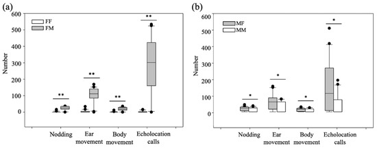 When the habituation file was F and the dishabituation file was M, four of the 20 R. ferrumequinum restarted nodding, ear movement, body movements, and the emission of echolocation calls. When the habituation file was F and the dishabituation file was M, 18 of the 20 R. ferrumequinum restarted nodding, ear movement, body movements, and the emission of echolocation calls (Figure 6a). When the habituation file was M and the dishabituation file was F, 18 of the 20 R. ferrumequinum restarted nodding, ear movement, body movements, and the emission of echolocation calls. When the habituation file was M and the dishabituation file was M, seven of the 20 R. ferrumequinum restarted nodding, ear movement, body movements, and the emission of echolocation calls (Figure 6b). The proportions of responding bats were significantly different for the four different combinations of playback types (Pearson chi-square test: λ = 33.17, df = 3, p < 0.01; Fisher’s exact test: p < 0.05). The numbers of nodding, ear movements, body movements, and echolocation pulses after conversion to different sex calls, were significantly different for R. ferrumequinum compared to a conversion to same sex acoustic stimuli (nodding: pF = 0.004, PM = 0.013; ear movements: pF < 0.001, PM = 0.019; body movements: pF = 0.005, pM = 0.016; echolocation calls: pF < 0.001, pM = 0.017; Figure 6a,b).