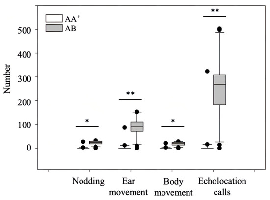 Results of the echolocation call individual identification habituation-dishabituation playback experiment for Rhinolophus ferrumequinum. A and B represent two different individuals. AA’ represents a change from the habituated sound file of individual A to another sound file of individual A. AB represents a change from the habituated sound file of individual A to the dishabituated sound file of individual B. * denotes p < 0.05, and ** denotes p < 0.01.