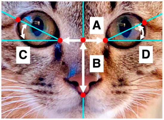Based on the baby schema measures [7,16], we mapped eyes and midlines. As cats open and close their eyelids very differently depending on the brightness, the size of the eyes cannot be accurately measured from photographs. Therefore, we measured nose length as a possible indicator of baby schema [2]. Using the measuring tool in Adobe Photoshop 21.2 2, the distance between the eyes (A) and the length from the center line of the eye to the bottom of the nose (B) were measured; hereafter, we refer to “nose length” as nose length adjusted by the cat’s facial size (practically adjusted by the distance between the two eyes), that is, B/A in Figure 2. We also measured the tilt angles of the left and right eyes, which are considered to influence facial impressions in humans [34], and recorded the average value of the eye angles, that is, (C+D)/2 in Figure 2.
