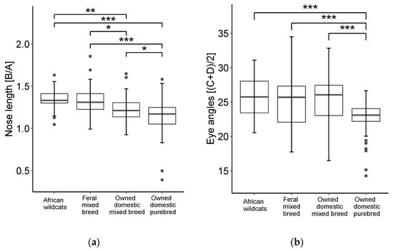 We measured nose length and eye angles for the four groups of cats (Figure 4). Nose length adjusted by face width (i.e., B/A in Figure 2) had the following means: 1.34 (SD = 0.11) for African wildcats, 1.32 (SD = 0.17) for feral mixed breed, 1.23 (SD = 0.14) for owned domestic mixed breed, and 1.14 (SD = 0.21) for owned domestic purebreds. The eye angles had the following means: 25.61 (SD = 3.06) for African wildcats, 25.10 (SD = 3.57) for feral mixed breed, 25.31 (SD = 3.67) for owned domestic mixed breed, and 22.77 (SD = 2.36) for owned domestic purebreds.